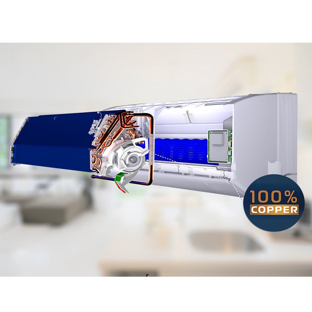 Blue Star AC's condenser coil, evaporator coil, and connecting tubes are made of 100% copper, thereby ensuring reliable cooling performance and enhanced durability.