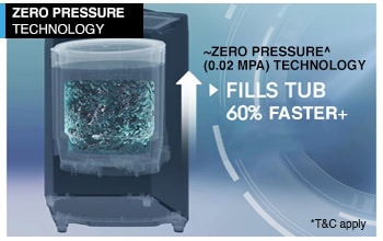 The unique zero pressure technology fills tub 60% faster. Results based on internal lab tests done on select Godrej models at low water pressure of 0.2 bar under specific test conditions and may vary depending on testing conditions.