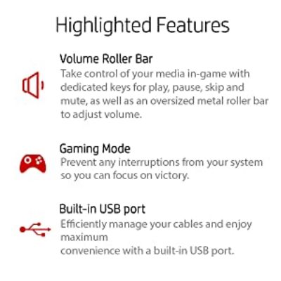• Take control of your media in-game with dedicated keys for play, pause, skin and mute, as well as an over-sized metal roller bar to adjust volume.