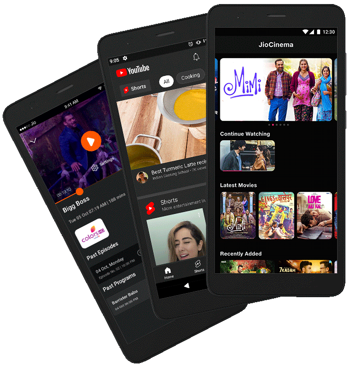 Jio and Google apps. Unlimited entertainment. Anytime, anywhere with JioTV, JioCinema, YouTube and other apps.