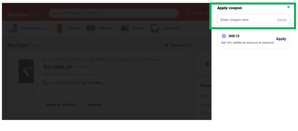 Alternatively, you can enter your coupon code in the highlighted section. Then,