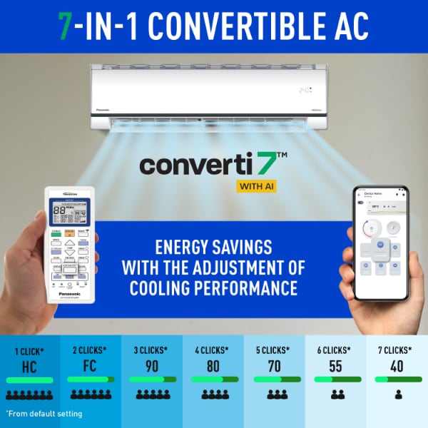 While Panasonic Inverter Air Conditioners are truly auto convertible, there is a provision to manually adjust the AC for up to 7 stages of cooling performance ranging from 40% to more than 100%, this can be done via Converti7 button on the remote or on the MirAie app