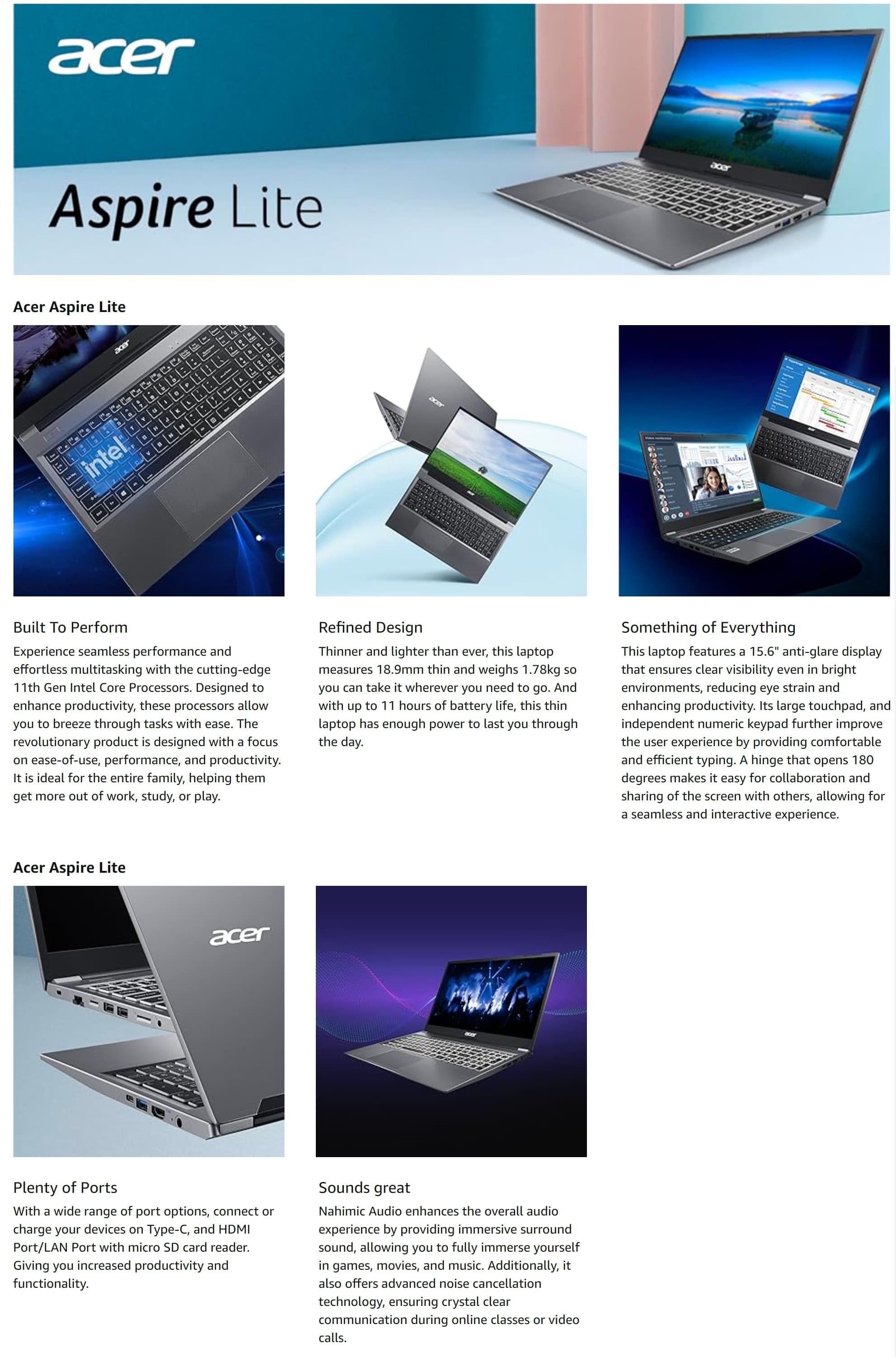 Acer Aspire Lite AL15-41 Standard Laptop (AMD Ryzen 7 5700U/DDR4 16GB/512 GB /AMD Radeon Graphics/Windows 11 Home/Office Home and Student 2021/Full HD), 39.62 cm (15.6 inch), Steel Grey