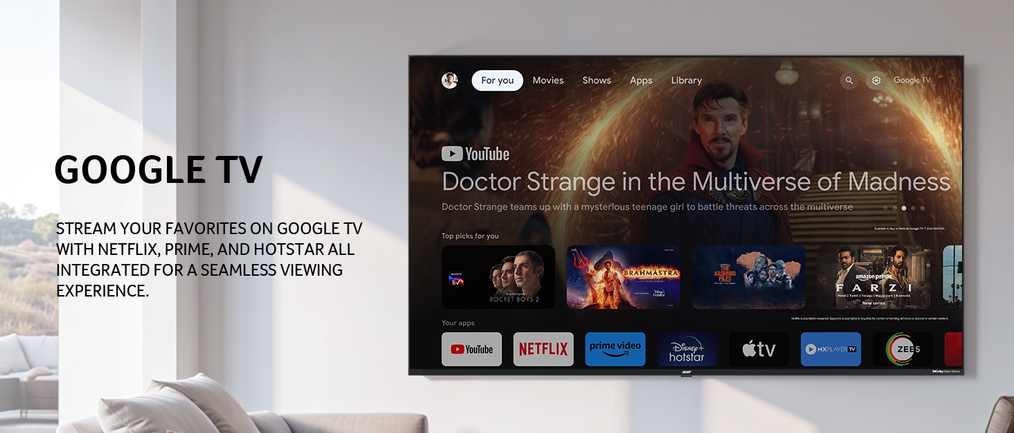 - Supported Apps: Prime Video, Netflix, Disney + Hotstar, YouTube & Google Play