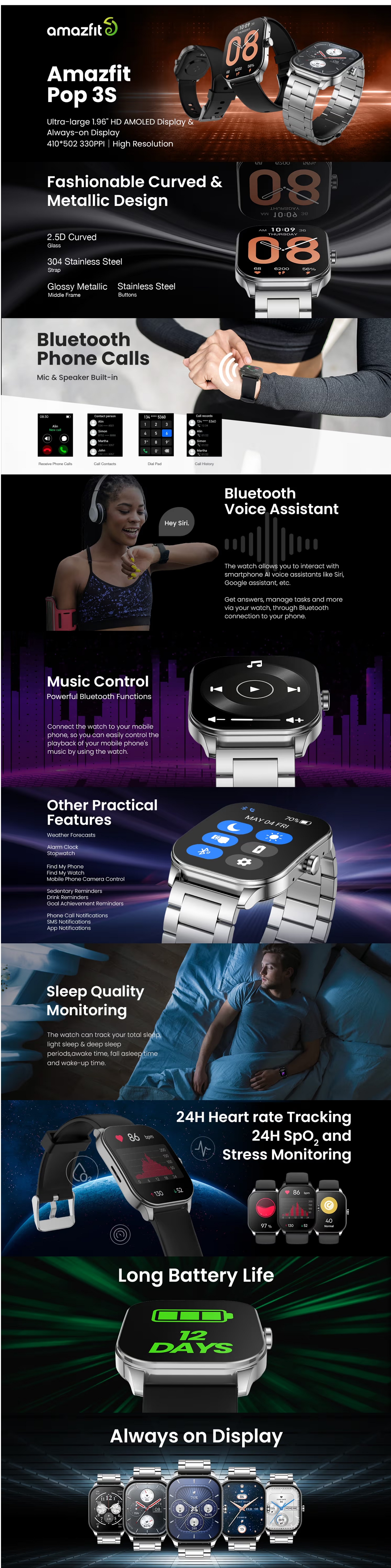 Amazfit Pop 3S Smartwatch, 4.97 cm (1.96 inch) Ultra-Large AMOLED Display, Bluetooth Calling, Upto 12 Days Battery, 24H SpO2, Heart Rate & Stress Monitor, AI Voice Assistant, Metallic Design (Metallic Silver)