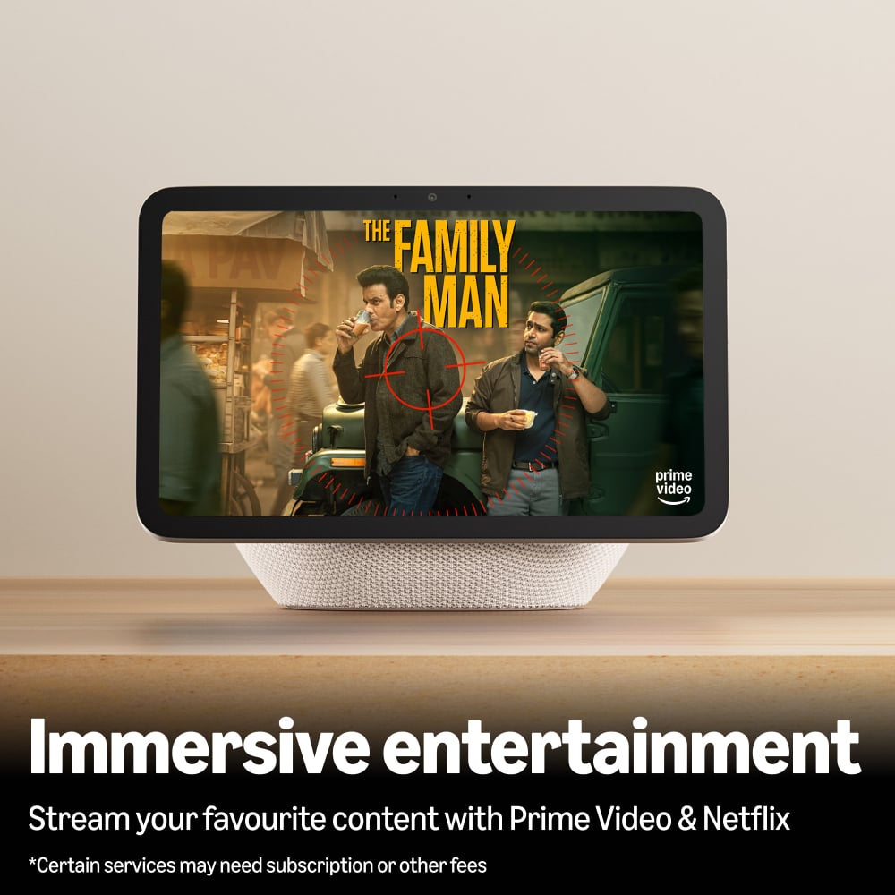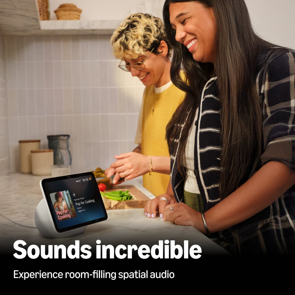 - Content sounds incredible. Stream music or watch shows on Prime Video, Netflix, and more. All with room-filling spatial audio, crisper vocals, wider sound stage, and up to 2x bass versus Echo Show 8 (2023 release). Certain services may require separate subscriptions and are subject to change at any time without notice