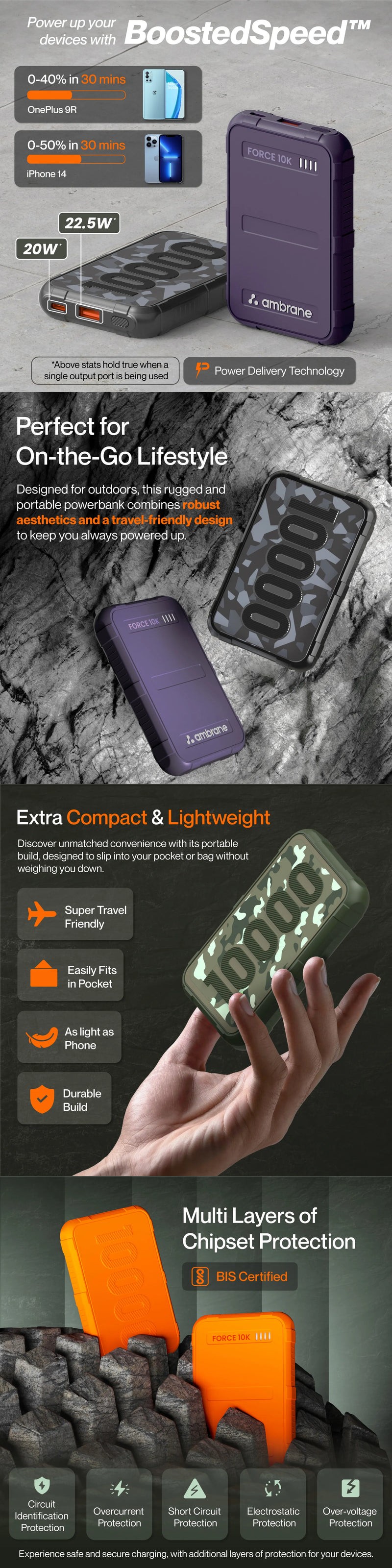 Ambrane 10000 mAh Power Bank Force 10K, 22.5 W, Dual Output 1 USB & 1 Type C, LED Indicator, Cable Included, Short Circuit Protection, Overcurrent Protection, Multi layer Chipset Protection, Dark Green