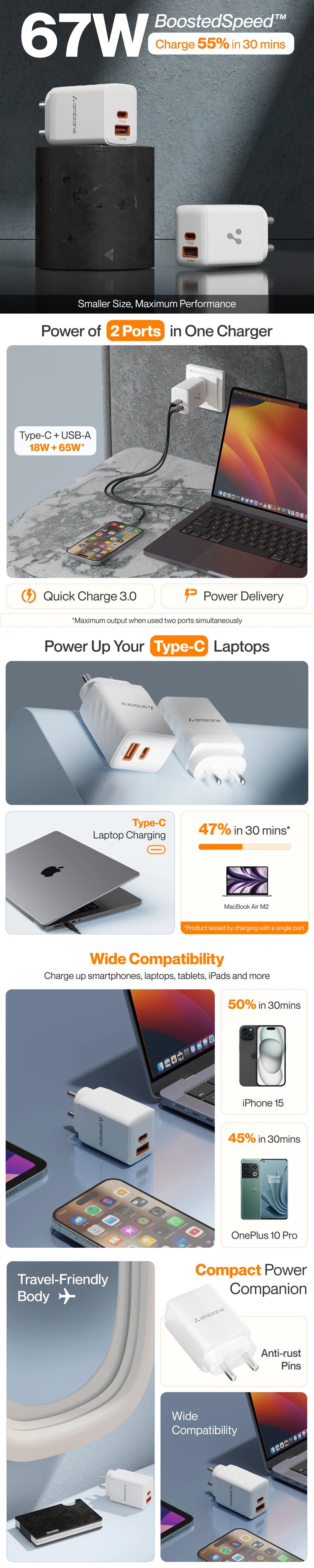 Ambrane 67 Watt GAN Charger, Dual Ports Type A & C, Boosted Speed, MacBook & Type C Laptop Charging,Quick Charge 3.0, Power Delivery Technology, White