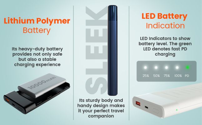 - Lithium Polymer 10000 mAh capacity- It enables effective multiple charging of devices. Compatible with earbuds, iPads, smartphones, and other electronic gadgets.