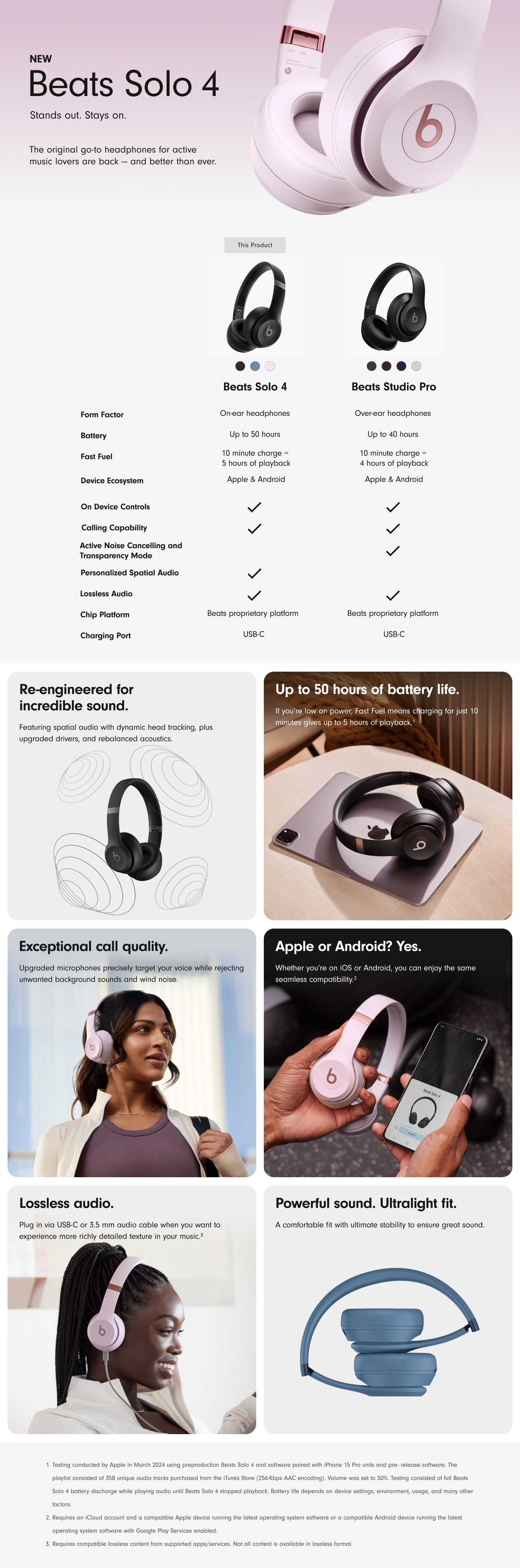 Beats Solo 4 On-Ear Wireless Headphones with upto 50 Hr battery, Spatial Audio with Dynamic head Tracking, Quick Charge(10 min = 5 Hr), Cloud Pink