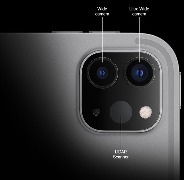 LiDAR. The LiDAR Scanner measures how long it takes light to reflect back from objects, so it can create a depth map of any space you’re in and unlock immersive AR experiences. And it works with the powerful ISP to more accurately focus images and videos in low‑light conditions and reduce capture time.