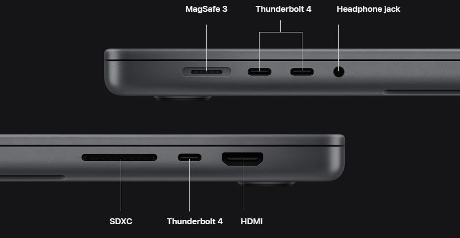 Transfer photos and videos with an SDXC card reader. Connect to TVs or displays with HDMI output, which now supports up to 8K. Plug in accessories and additional displays using three Thunderbolt 4 ports. And enjoy up to two times faster throughput with Wi‑Fi 6E.