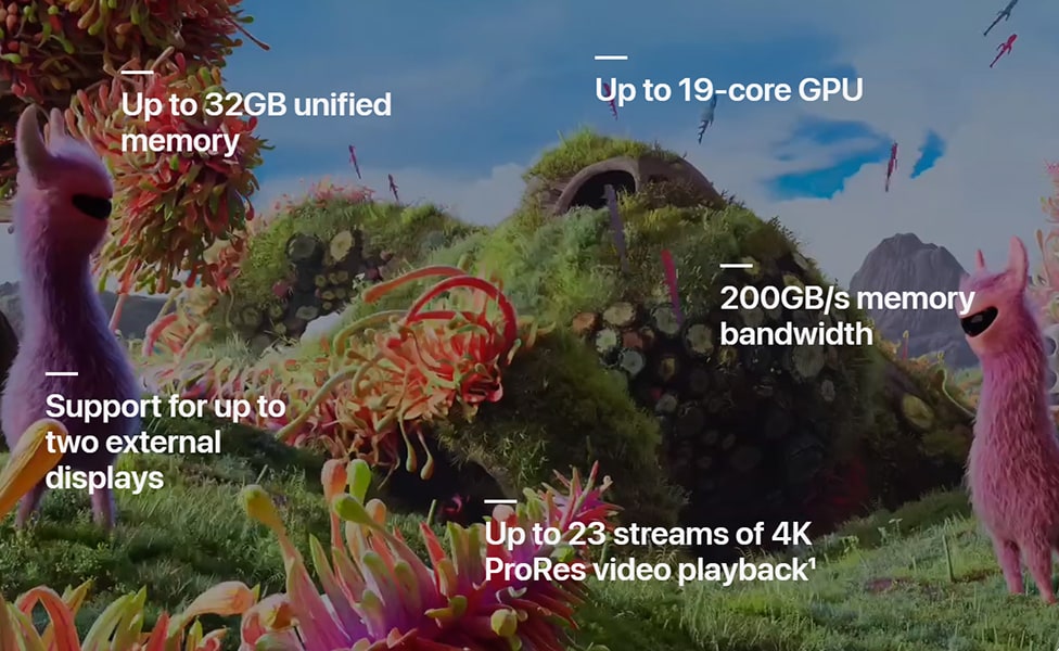M2 Pro brings power to take on even more demanding projects. The up to 12‑core CPU and next‑generation Neural Engine make pro workflows fly — from sorting and editing thousands of images to running computational fluid dynamics simulations. And the up to 19‑core GPU drives a huge boost in graphics performance for both work and play.