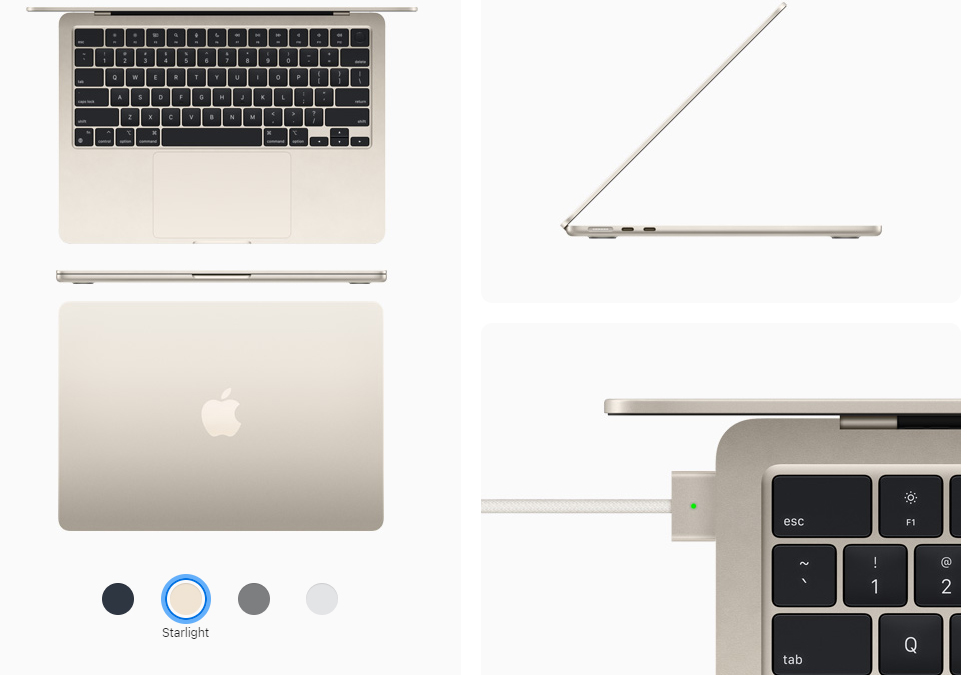 MacBook Air comes in four gorgeous finishes — each with its own matching MagSafe charging cable.