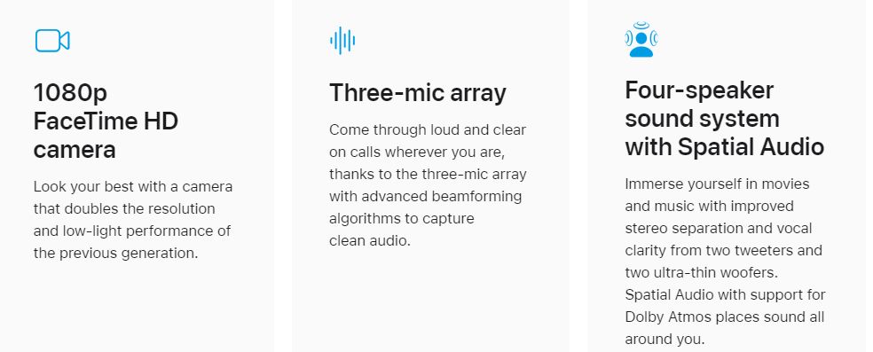 Make your best impression on video calls with the 1080p FaceTime HD camera and three‑mic array. Surround yourself with an expansive soundstage, compliments of the four‑speaker sound system with Spatial Audio. MacBook Air was designed to thrill the senses.