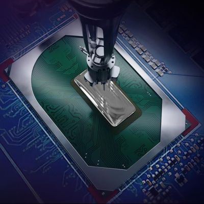 Liquid metal compound from Thermal Grizzly reduces CPU temperatures by up to 10°C* compared to standard thermal paste. The right amount must be applied meticulously for the best results, so we commissioned custom equipment that automates the process with mechanical precision. The block that sits on the CPU also has a special internal fence that prevents liquid metal from leaking out over time.