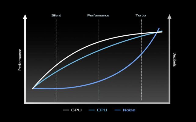 Gaming laptops are versatile enough to tackle a range of tasks, but requirements vary wildly, so Intelligent Cooling adapts accordingly. It automatically switches between operating modes that optimize performance and acoustics for different games and applications. Turbo mode uses the highest fan speed and clocks to sustain maximum speed. Performance mode adjusts the clocks and cooling to lower noise levels for gaming, and Silent mode runs even quieter for lighter work and entertainment.