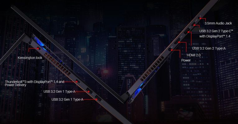 The USB Type-C with Thunderbolt™ 3 support gives creators, gamers, and power users flexibility to expand their workstations anywhere. Connect multiple displays for more efficient multitasking, add on high-speed storage for lightning fast multimedia editing and transfers, or plug your set-up into a more powerful battlestation to reach new levels of pro performance. With a peak interface bandwidth of up to 40Gbps, 4x the throughput of USB 3.1, you can output media to UHD TVs, monitors, and more at up to 8K resolution.