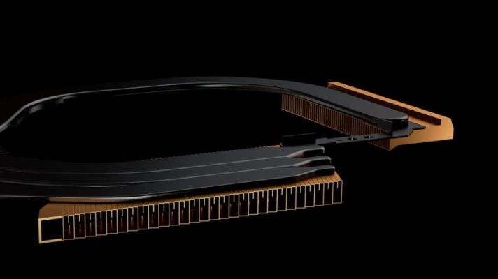 Thermal energy is dissipated by four heatsinks in the flanks. Each one is lined with ultra-thin copper fins as slim as 0.1mm, allowing higher density and lower air resistance than typical fins that are twice as thick. Airflow is strongest on the far side of the heatsink. The fins on the other side capture air at a lower angle, so they alternate in length and use special chamfers to reduce turbulence and improve heat exchange. In total, there are 220 heatsink fins that create 111,700mm2 of surface area, and the ones on the sides are angled slightly toward the back to direct warm air away from your mousing hand.