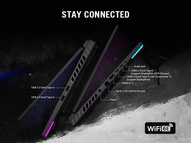*This Asus ROG 16 Laptop images is for illustration purpose only. Actual image may vary.In modern multiplayer games, a stable internet connection is imperative. The Strix G16 is ready to join the fight with a dedicated RJ45 port, as well as the latest Wi-Fi 6E wireless standard. On Wi-Fi 6E supported networks, enjoy access to the newest wireless band, free from clutter and interference from your home’s other wireless devices, ensuring you never lag out again.