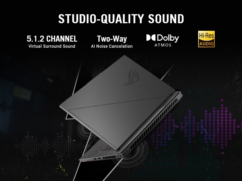 *This Asus ROG 16 Laptop images is for illustration purpose only. Actual image may vary.Dual Dolby Atmos-powered speakers create an authentic sound stage for your games. Hi-Res audio ensures you hear your music in the same quality it was recorded. Two-Way AI Noise Cancelation processes both incoming and outgoing audio to filter any errant background noises, making sure that your calls, chats and streams come through without distraction.