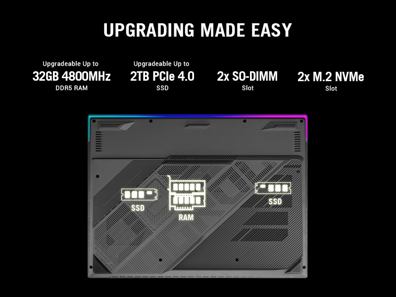 *This Asus ROG 16 Laptop images is for illustration purpose only. Actual image may vary.Upgrading your RAM and SSD is simplified with an easy-upgrade design that gives you fast access to memory slots and storage bays. With a standard screwdriver, you can easily remove the screws at the bottom of the chassis to make your desired modifications. A special pop-open screw raises one corner of the bottom panel, making it easier to separate. Quickly upgrade or replace your RAM, or increase your superfast SSD capacity by adding a second PCIe drive.