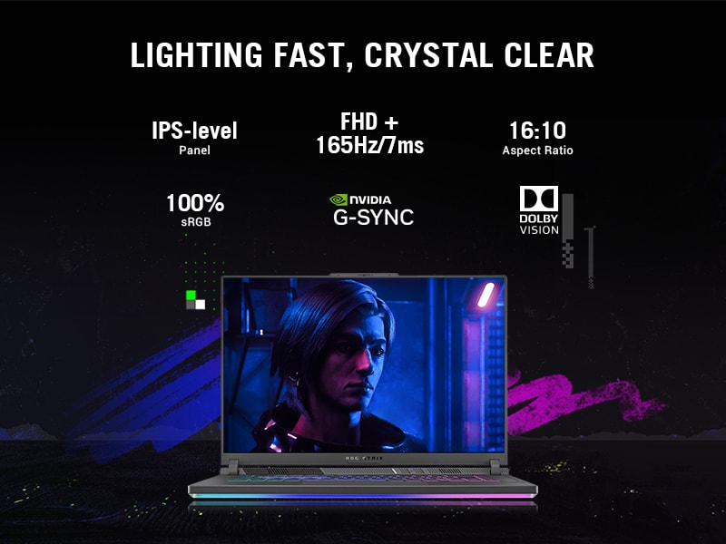 *This Asus ROG 16 Laptop images is for illustration purpose only. Actual image may vary.This Strix G16 features an FHD+ 165Hz 16:10 panel with 100% sRGB color Gamut which offers fantastic color, Dolby Vision, Adaptive-Sync support, and a 90% screen-to-body ratio for stellar gaming and viewing experience.