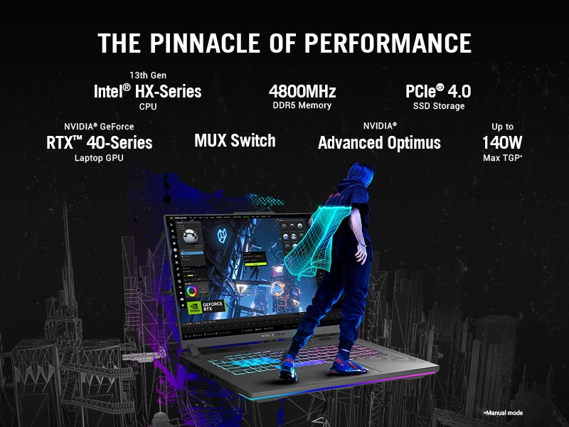 *This Asus ROG 16 Laptop images is for illustration purpose only. Actual image may vary.Powered by a 13th Gen Intel HX-Series Processor and NVIDIA GeForce RTX 40-Series Laptop GPU boasting a max TGP of 140W with Dynamic Boost, be ready to dominate the competition in all of the latest games. Backed up with a dedicated MUX Switch and NVIDIA Advanced Optimus support, With PCIe Gen4x4 SSD storage and 4800MHz DDR5 RAM, large game libraries and intense multitasking sessions are a breeze for this gaming machine.