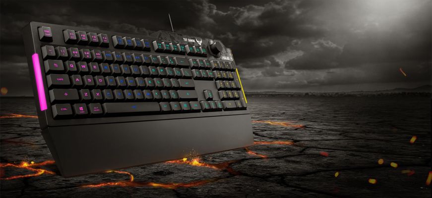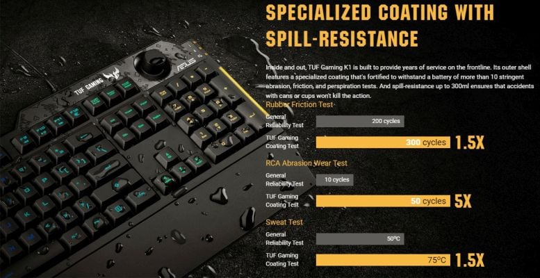 ASUS TUF Gaming K1 is a gaming keyboard that delivers uncompromising performance and exceptional durability. It's equipped with switches that deliver silent tactility with every press. These are housed in a 300 ml spill-resistant frame that's fortified by a specialized coating and validated for tough duty. K1 also features customizable RGB illumination and side-mounted light bars for personalized style, a dedicated volume knob for fast, intuitive control and a detachable ergonomic wrist rest for extended comfort.