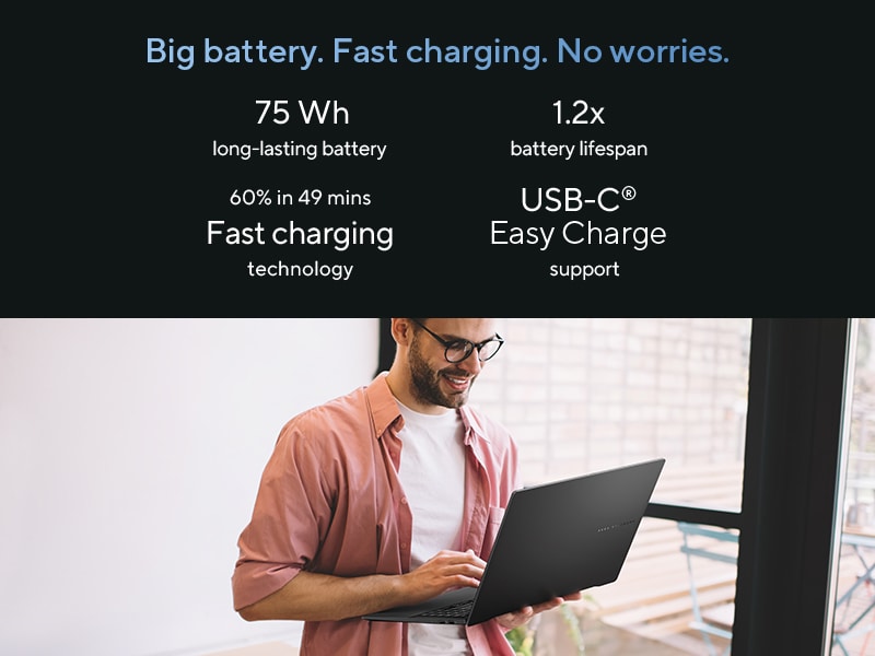 *This Asus VivoBook S14 Laptop images is for illustration purpose only. Actual image may vary.Say goodbye to battery anxiety! ASUS Vivobook S 14 OLED boasts a generous 75 Wh high-capacity battery, providing long-lasting power for your entire day. What’s more, its fast-charging technology enables swift recharges so you can swiftly return to work or play without any delays.