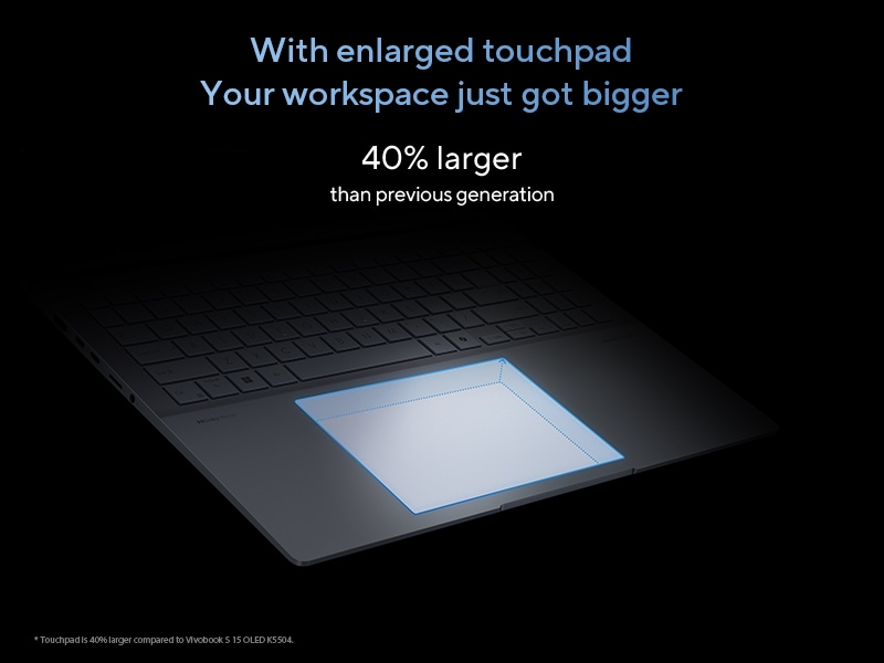 *This Asus VivoBook S14 Laptop images is for illustration purpose only. Actual image may vary.ASUS Vivobook S 14 OLED has an enlarged touchpad for improved workflow and effortless navigation, ensuring precise and seamless interactions whether you’re working on projects, browsing the web, or relaxing.