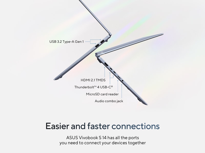 *This Asus VivoBook S14 Laptop images is for illustration purpose only. Actual image may vary.ASUS Vivobook S 14 OLED has all the ports you need to connect your devices together. Whether you want to connect an external display, a mouse, a keyboard, a speaker, or a headset, you can do so effortlessly.