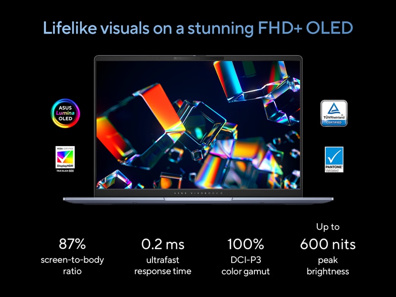 *This Asus VivoBook S14 Laptop images is for illustration purpose only. Actual image may vary.ASUS Lumina OLED displays are more accurate, more adaptive, and more reliable than other OLED displays, making them the ultimate choice for professionals, gamers, and entertainment enthusiasts who demand the best.