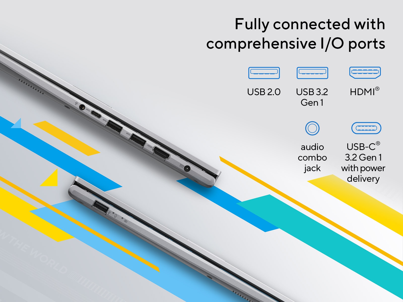 *This Asus Vivobook Laptop images is for illustration purpose only. Actual image may vary.Vivobook 15 keeps you fully connected with its comprehensive I/O ports. There are one USB 3.2 Type-C Gen 1 port, two USB 3.2 Type-A Gen 1 ports, a USB 2.0 port, HDMI output and an audio combo jack — so it’s easy to connect all your existing peripherals, displays and projectors.