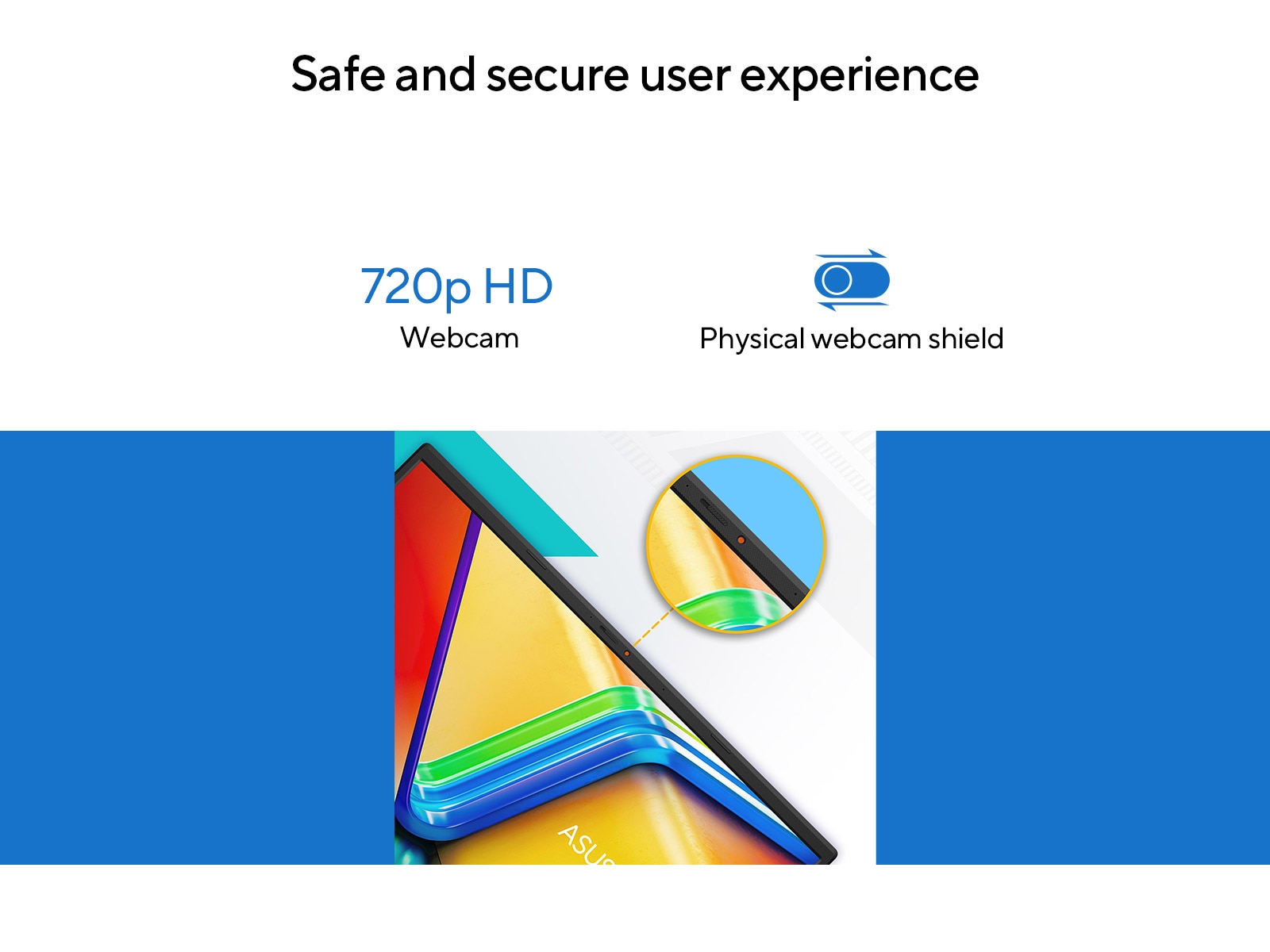 *This Asus Vivobook Laptop images is for illustration purpose only. Actual image may vary.Integrated privacy shield slides over the 720P HD webcam for instant privacy protection against prying eyes and disturbances.