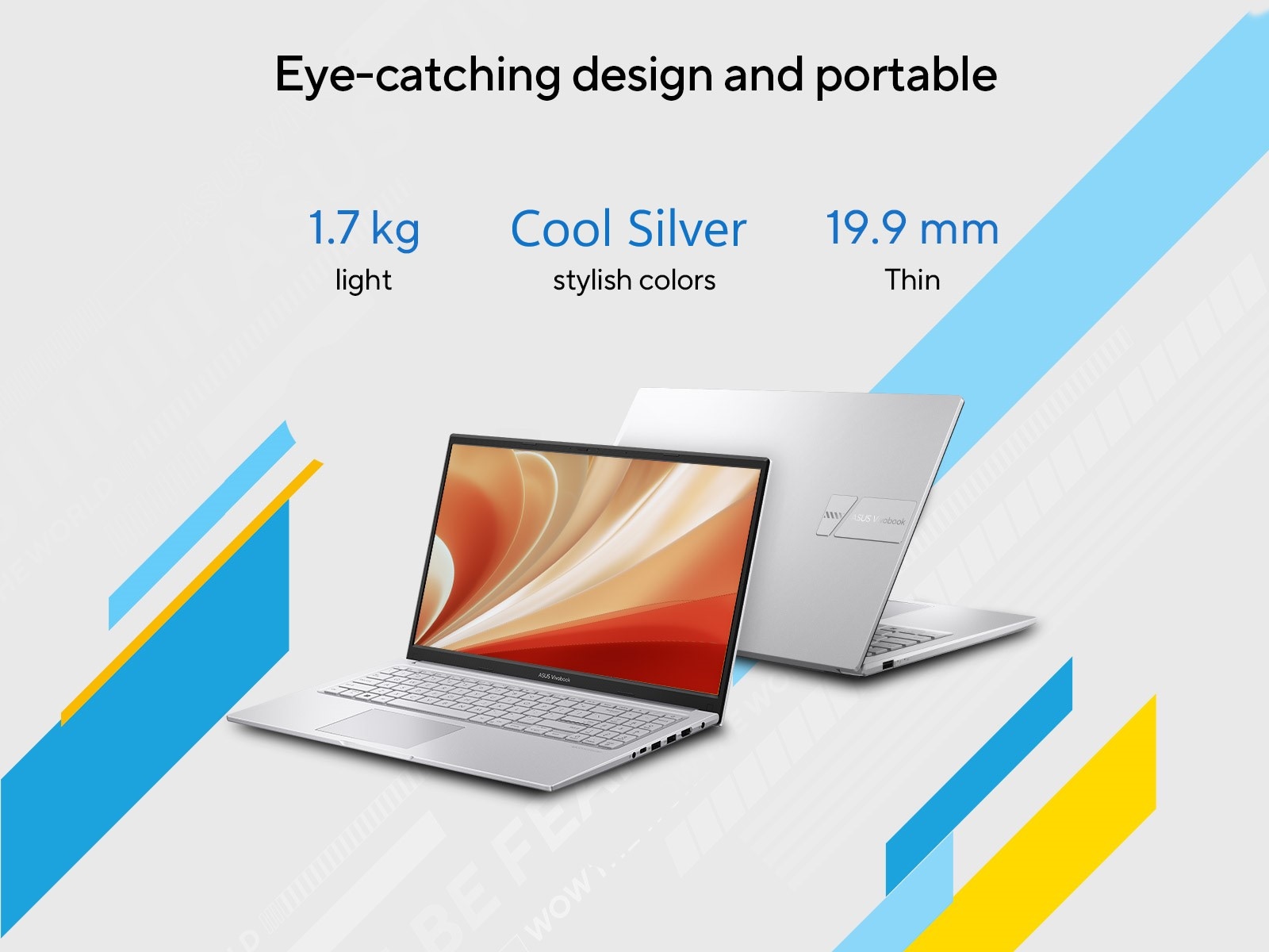 *This Asus Vivobook Laptop images is for illustration purpose only. Actual image may vary.Vivobook 15 has a lid with a special raised logo tag, and it’s available in your choice of three eye-catching colors: charming Quiet Blue, , or Cool Silver just pick your favorite! It’s slim enough to pop unobtrusively into any backpack, and light enough for easy one-handed carrying.