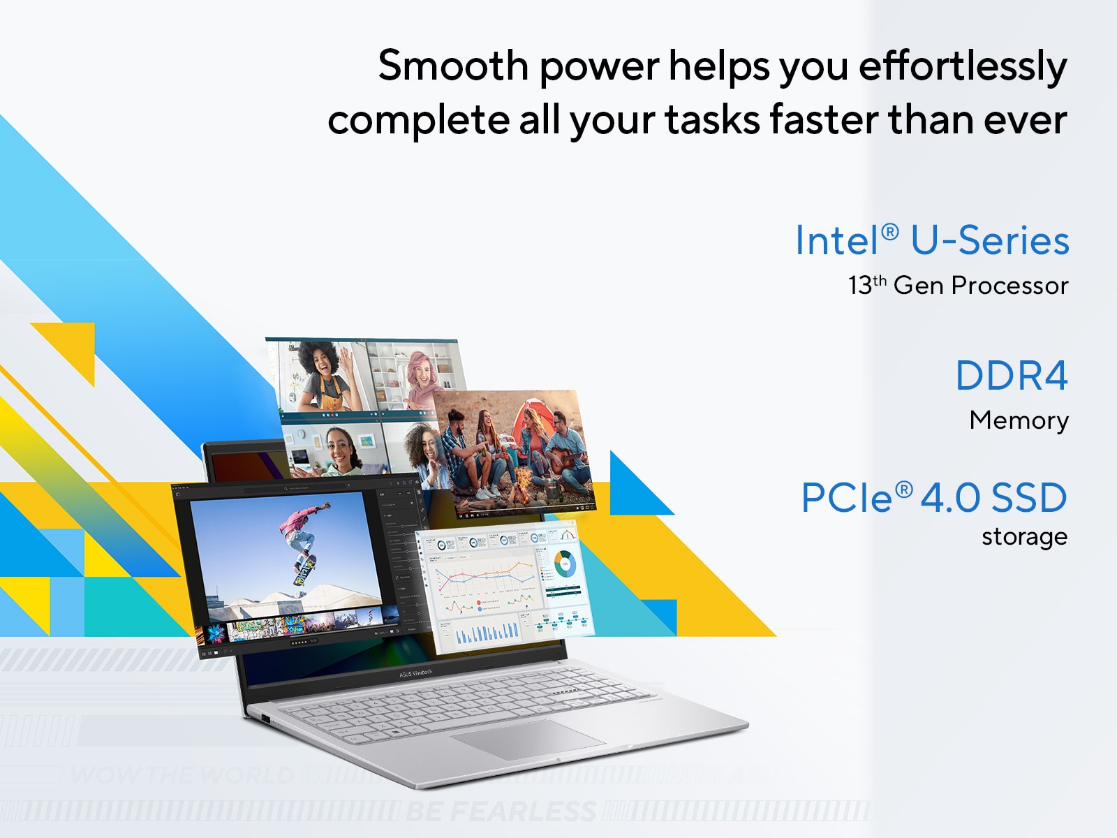 With Vivobook 15, you’re always ready to take on any everyday task, whether it’s work, play or entertainment. Whatever you need to achieve, there’s always plenty of computing power on tap with up to the 13th Gen Intel U-Series processor, DDR4 of fast memory, PCIe 4.0 of speedy SSD storage and comprehensive range of wireless connectivity up to WiFi 6E allows you to load online content in the blink of an eye.