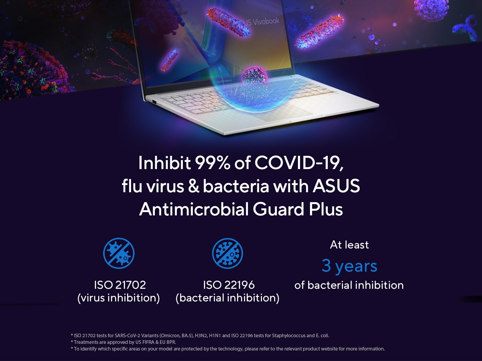 *This Asus Vivobook Laptop images is for illustration purpose only. Actual image may vary.ASUS Antimicrobial Guard Plus is applied to frequently touched areas of your laptop to help keep it hygienic. This technology uses a denser treatment* that inhibits viruses and bacteria. And it is scientifically shown — using the ISO 2170211 and 2219612 standards — to inhibit virus and bacteria growth by more than 99% over a 24-hour period4. Strains used for the tests include the SARS-CoV-2 (COVID-19), H3N2 (Influenza A) and the E. coli bacterium.
