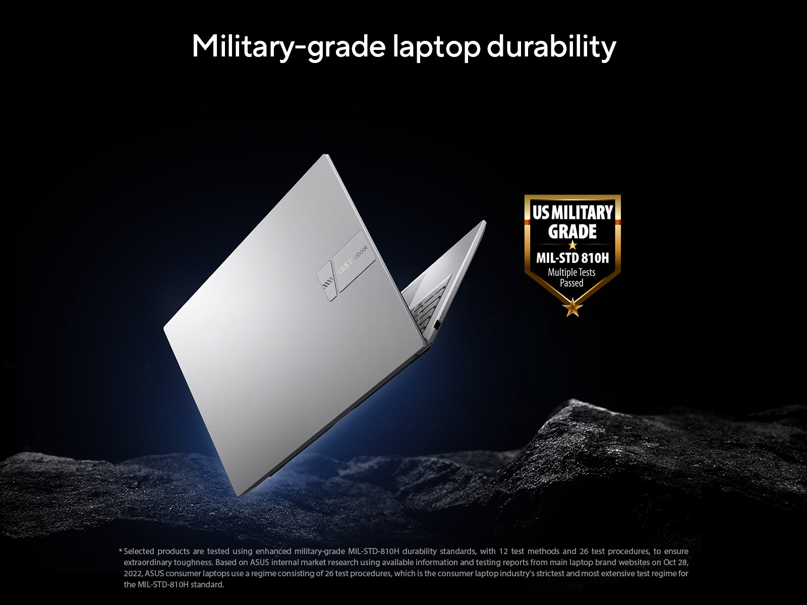 *This Asus Vivobook Laptop images is for illustration purpose only. Actual image may vary.ASUS laptops are engineered with extraordinary toughness meet the exacting US MIL-STD-810H military-grade standard, undergoing 12 rigorous test methods and 26 punishing test procedures — exceeding industry standards.