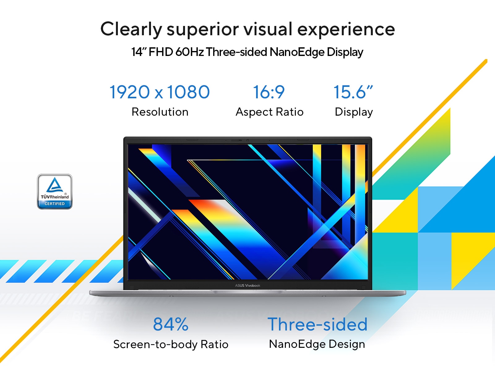 *This Asus Vivobook Laptop images is for illustration purpose only. Actual image may vary.Vivobook 15 delivers beautifully clear visuals with its three-sided slim-bezel NanoEdge display. The wide viewing angles maintain great quality even for off-center viewing, and the TÜV Rheinland eye-care certification ensures low blue-light levels that reduce the risk of eye strain during long viewing sessions.