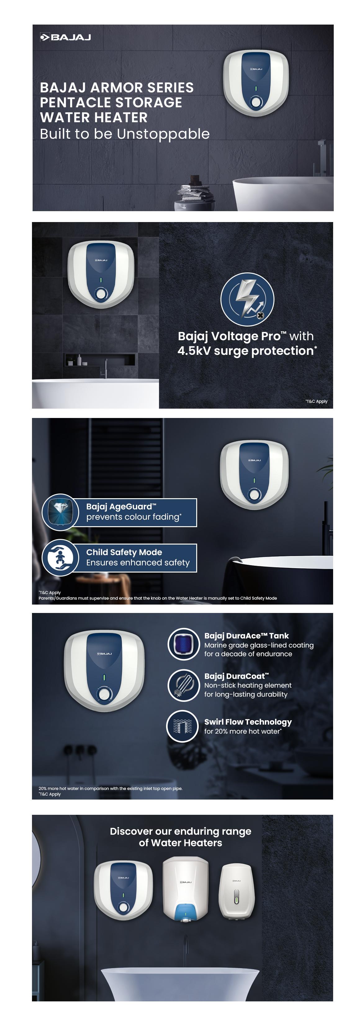 Bajaj Armor Series Pentacle 15 Litres Storage Geyser, White & Blue