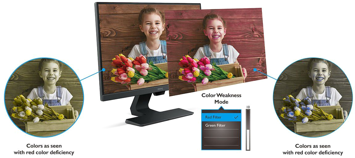 BenQ’s Color Weakness mode allows users who with color vision deficiency, the color to customize the amount of red or green displayed on the monitor with red and green filters. Once the red and green are neutralized, the mode ensures a comfortable viewing experience for all users and helps users to clearly distinguish between different colors. Additionally, BenQ’s color weakness mode also helps improve the viewing experience for people with Protanomaly (red-weakness) or Deuteranomaly (green-weakness)while allowing users to adjust the level of color weakness mode.
