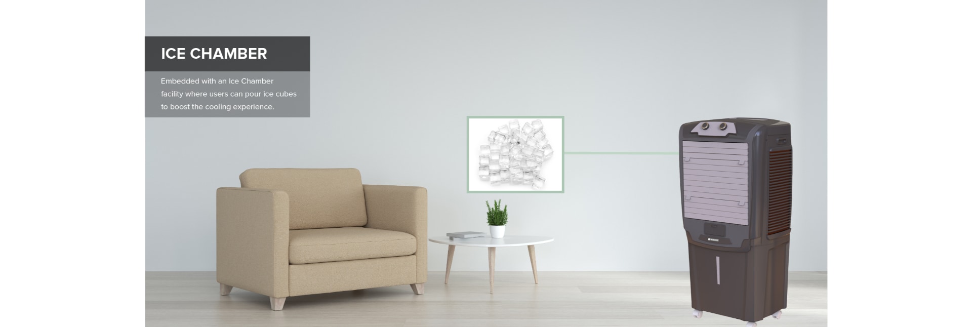 Embedded with Ice Chamber facility where user can pour ice cubes to boost the cooling experience.