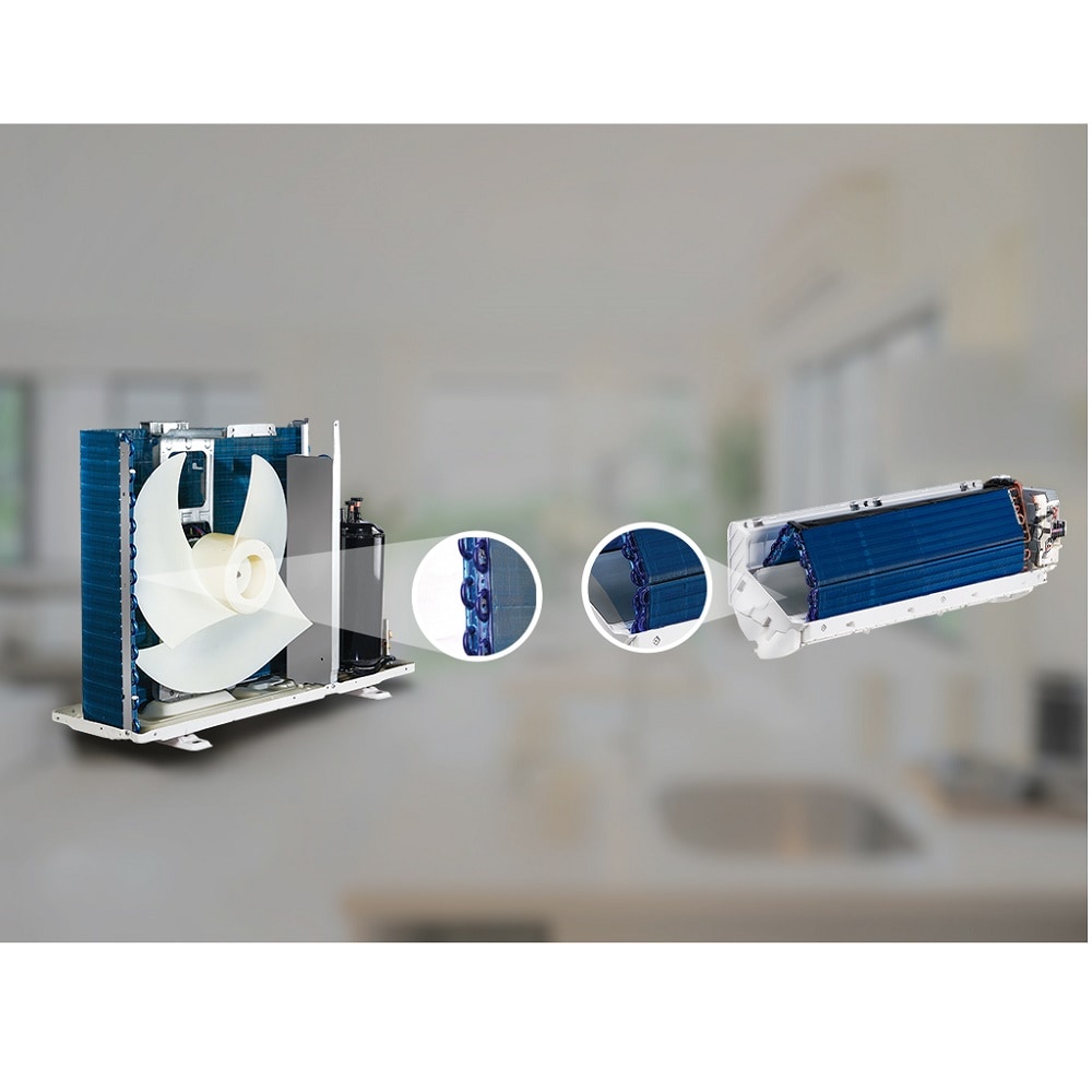 Special Nano BluProtect coating applied on copper tubes provides additional protection from corrosion and leakage due to dirt, salty air and industrial pollution, ensuring efficient cooling performance and longer durability.