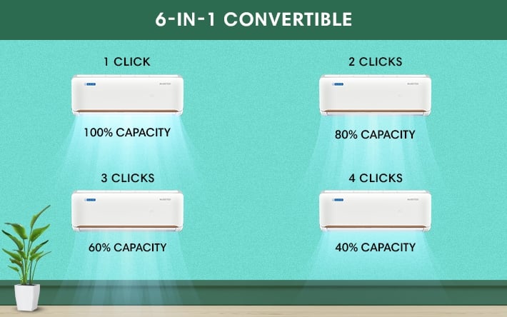 6-in-1 Convertible CoolingUnique 6-in-1 cooling mode to run your AC at 6 different capacities as per the desired comfort. It optimises power usage in real time as per your cooling needs.