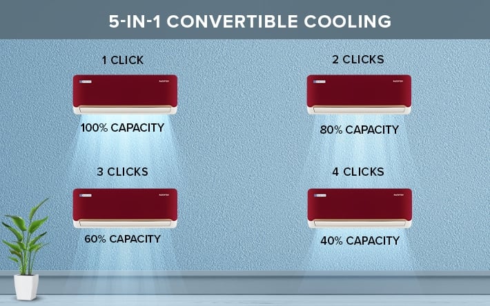 5-in-1 Convertible CoolingUnique 5-in-1 cooling mode to run your AC at 5 different capacities as per the desired comfort. It optimises power usage in real time as per your cooling needs.