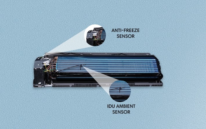 Anti-Corrosive Blue FinsThe blue fins protect the condenser and the evaporator coils from corrosion and leakage due to harsh climate, rainwater, salty air and humidity. It also enhances the efficiency and long life of the AC.