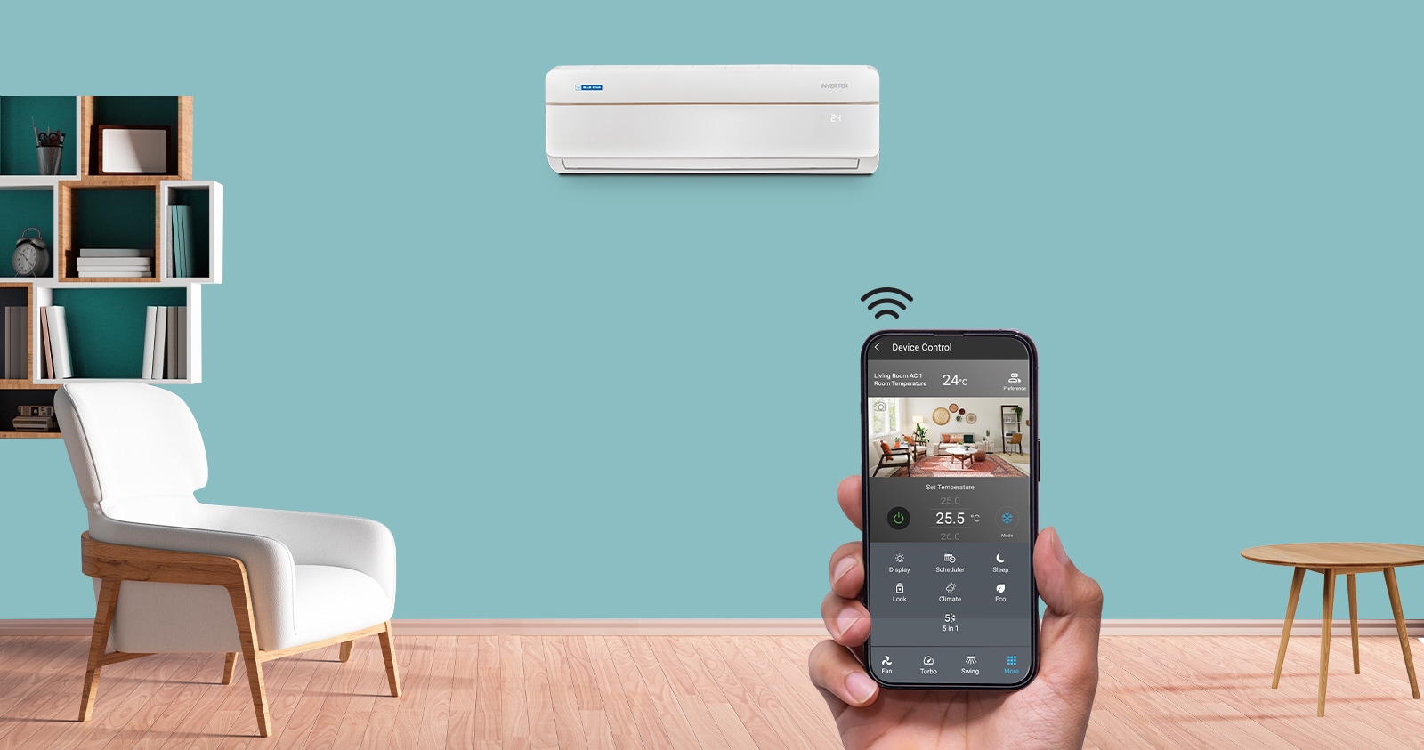 Smart Wi-Fi AC with Smart AppSet your room temperature from anywhere using your smartphone. Blue Star's Wi-Fi enabled Smart App allows you to set the desired temperature and control your AC.