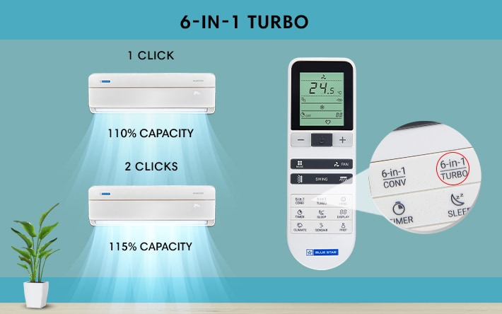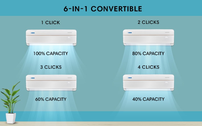 6-in-1 Convertible CoolingUnique 6-in-1 cooling mode to run your AC at 6 different capacities as per the desired comfort. It optimises power usage in real time as per your cooling needs.