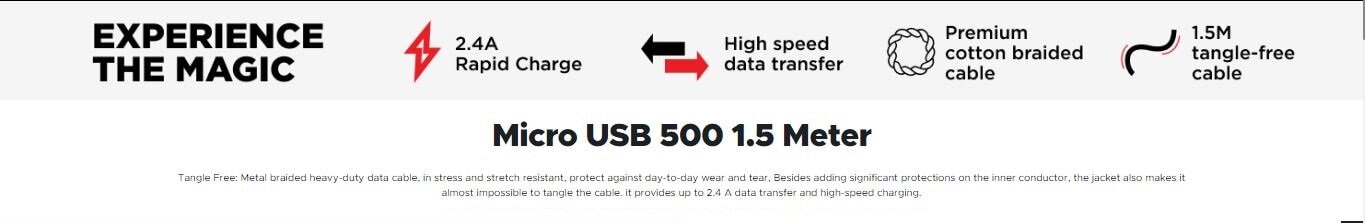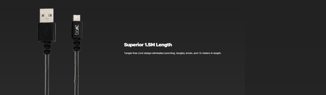Boat 500 MKI Tangle Free Micro USB Cable, Rapid Charge 2.4 A, Premium Nylon Braiding, 150 cm (1.5 m) length, Intelligent LED Indicator, Smart Auto Disconnect Charging, 480 Mbps Data Sync Rate, Carbon Black